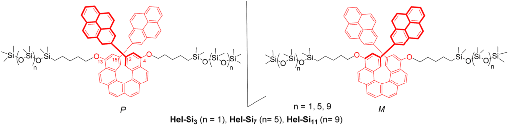Engineering circularly polarized light emission in nanostructured oligodimethylsiloxane-helicene chiral materials